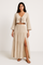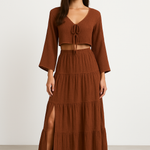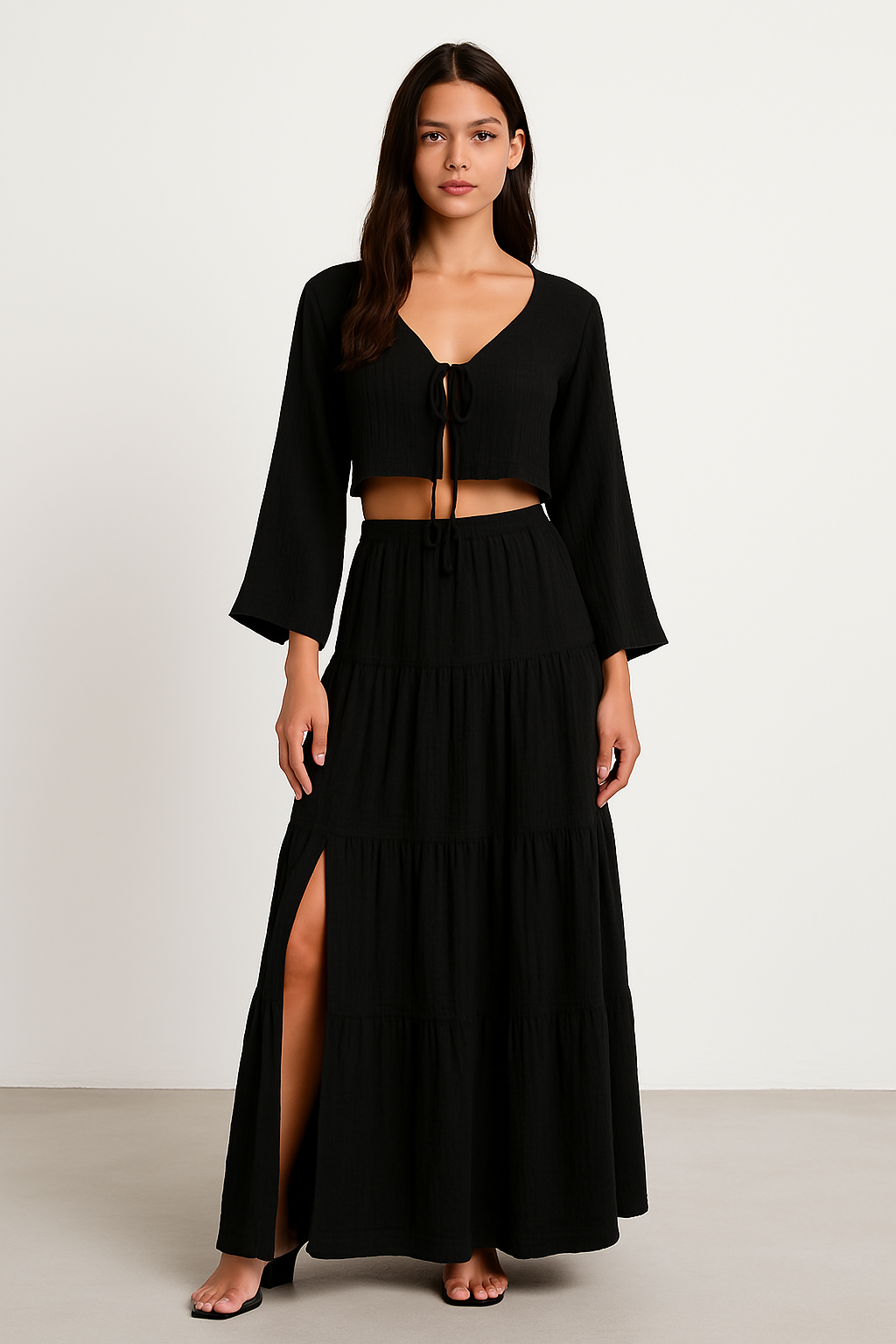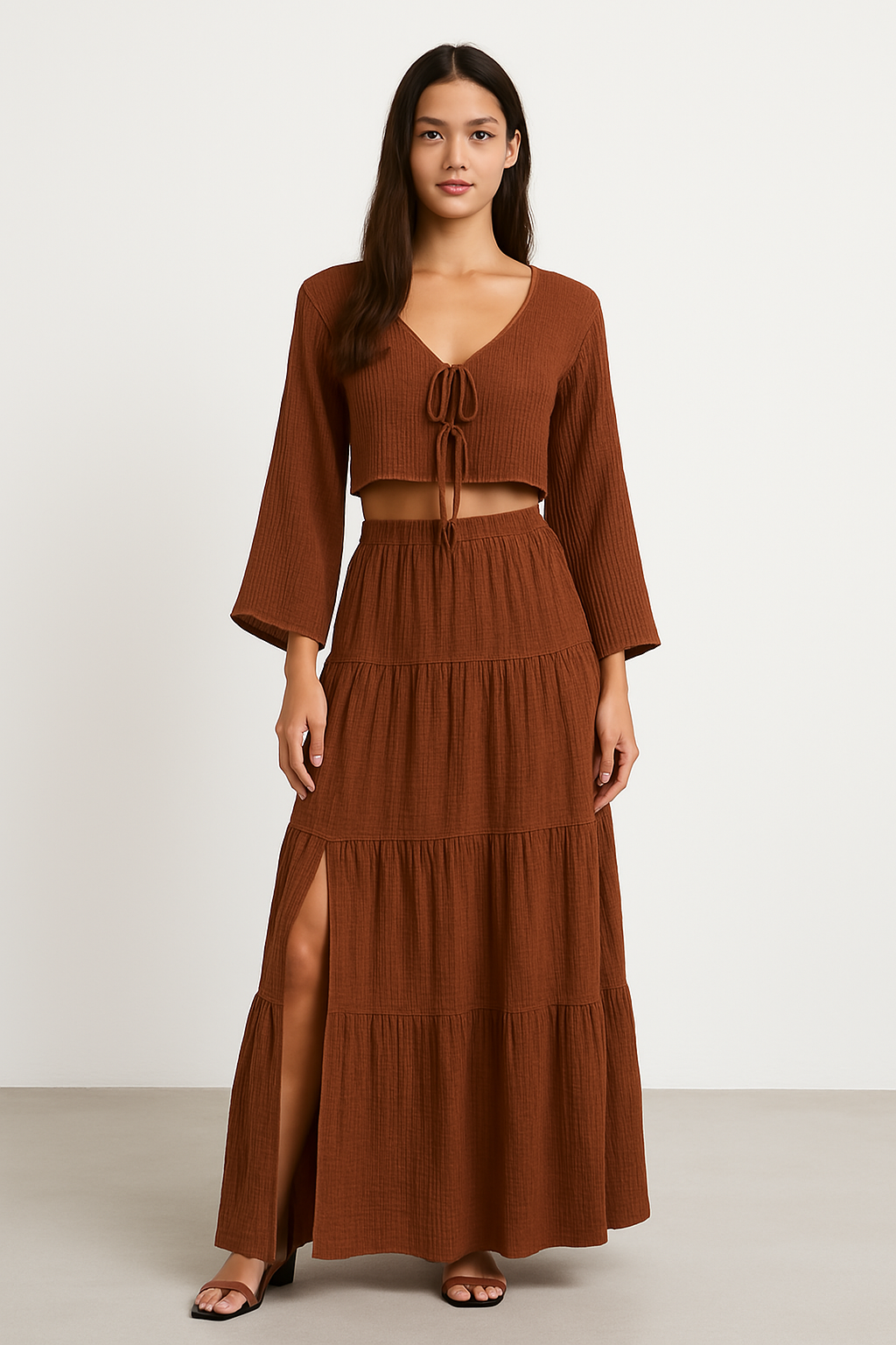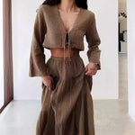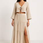 Forbedr din stil med dette todelte damesæt – bomulds- og hør – kort kjole med bindebånd – lang nederdel med slids fra Francis-Laurent. Et elegant sommerlook med en cropped cardigan med bindebånd foran og en lang nederdel med slids, perfekt til en afslappet, men elegant stil.