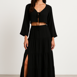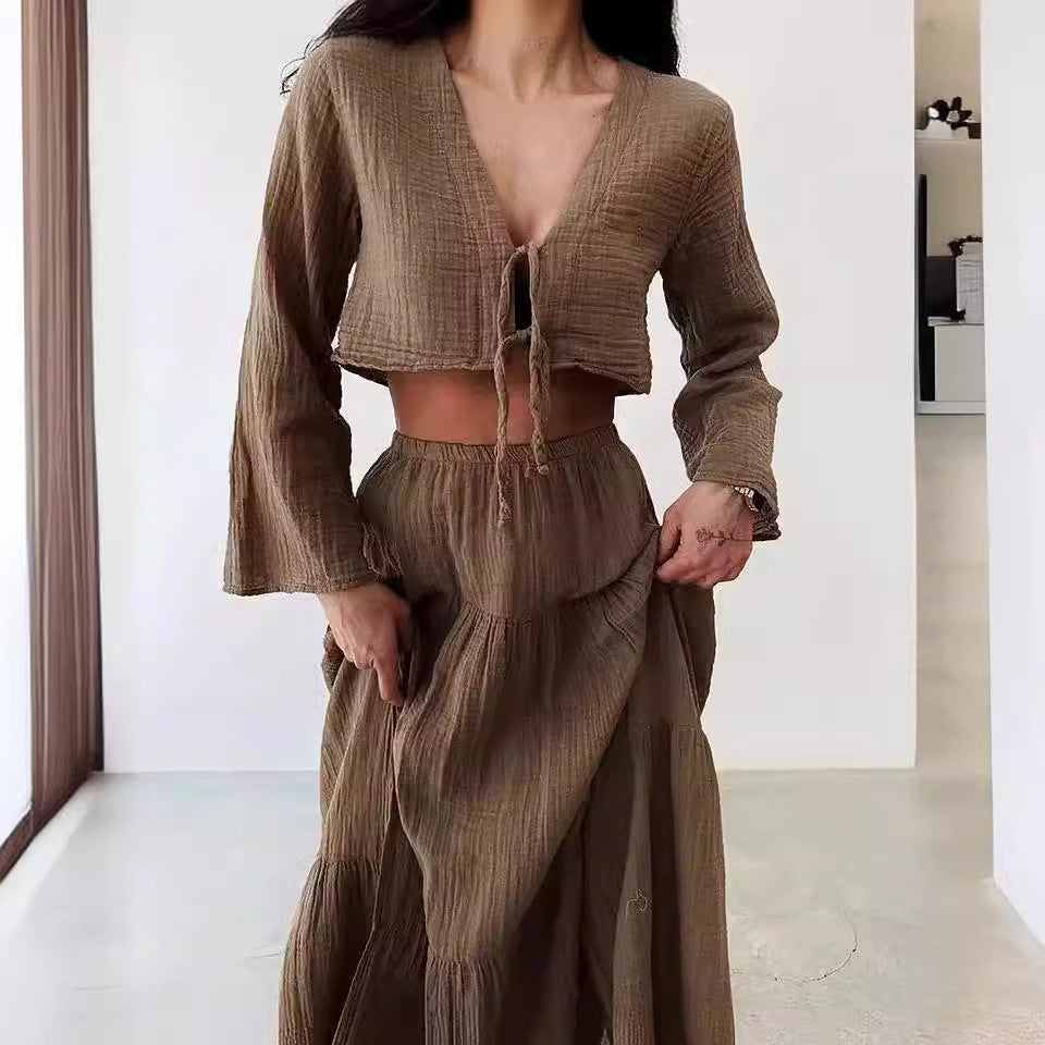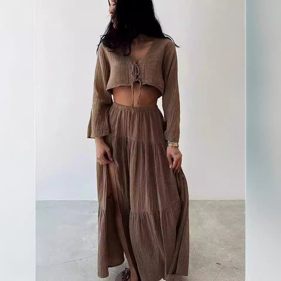 - Design: Todelt sæt med cropped cardigan med bindebånd foran og lang nederdel. Slids. Sæson: Forår/Sommer. Køn: Kvinder. Anledning: Afslappet, Strand, Sommeraften.