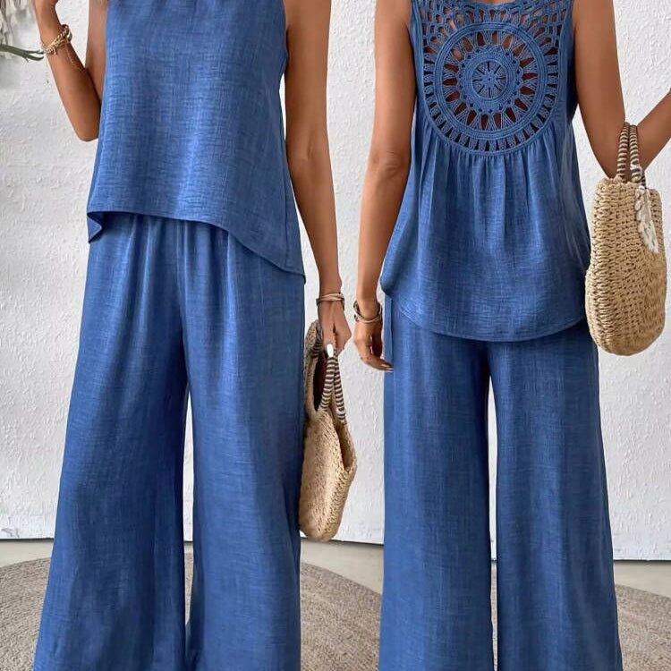 Damesæt i to dele – Hør – Ærmeløs hæklet top – Højtaljede bukser med vide ben