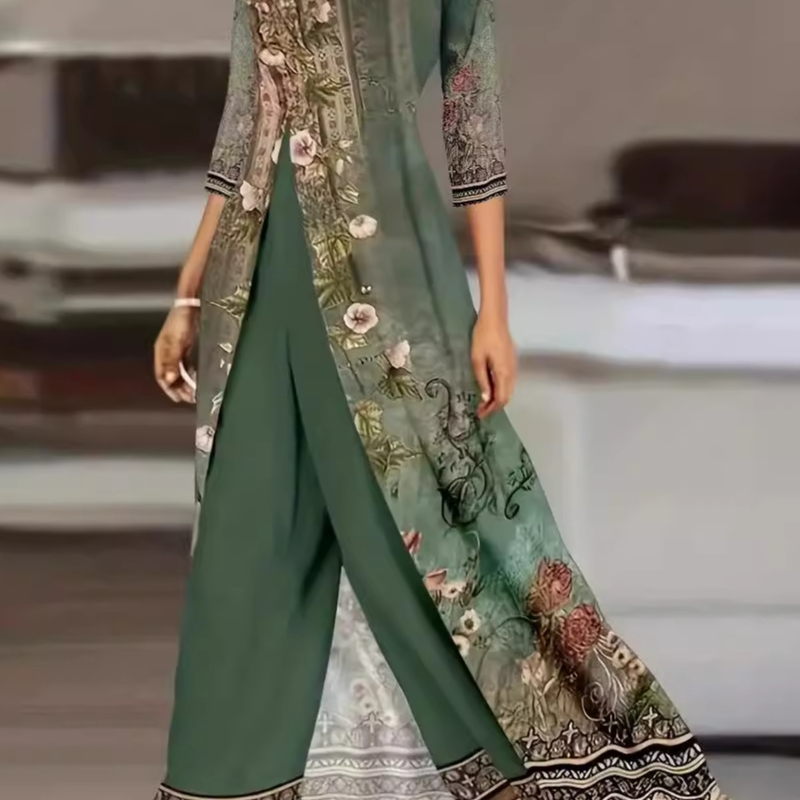 Damesæt med to dele – Flagrende snit – Lang top med print – Elegante bukser med vide ben