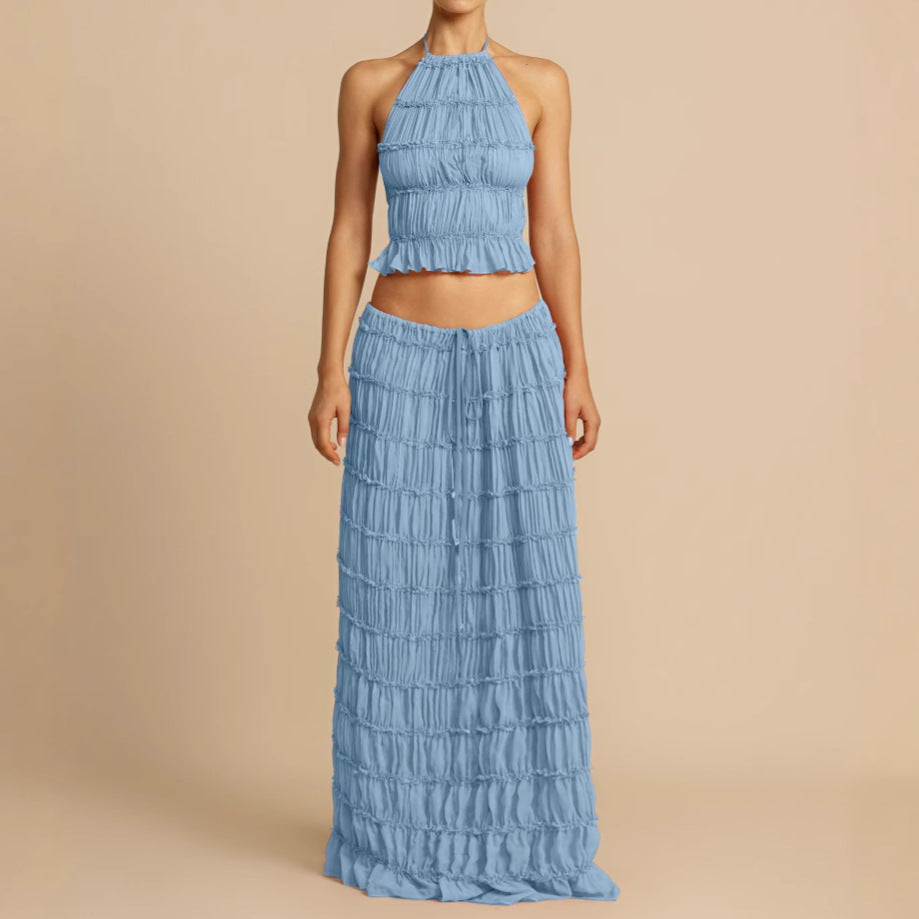 Damesæt i to dele – ruchet halterneck-top – lang nederdel med elastik i taljen – åndbart stof