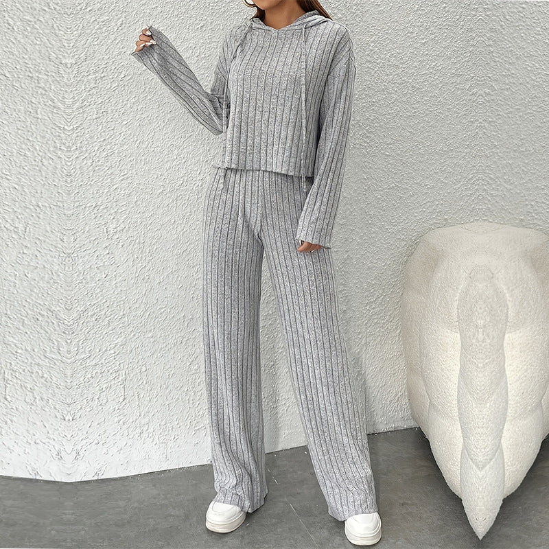 Dame loungewear-sæt – Hætte – Ribstrik – Afslappet pasform – Bukser med vide ben