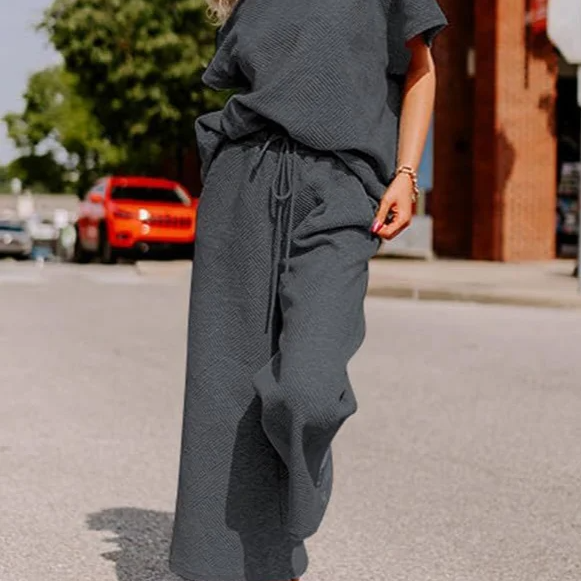 Dame loungewear-sæt – Afslappet pasform – 3/4-lang top med rund hals – Flagrende bukser med vide ben