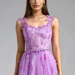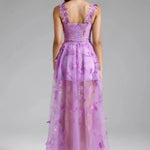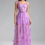Aftenkjole med spaghettistropper og sommerfuglemotiv