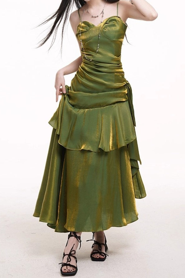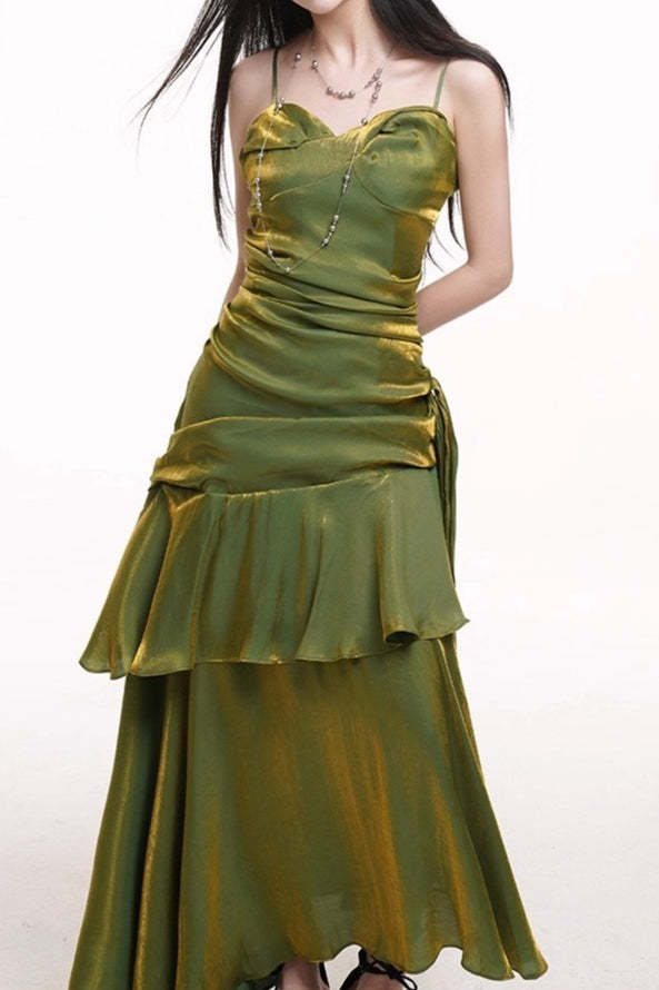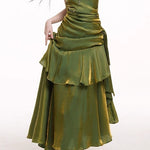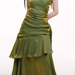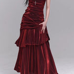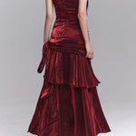 Bordeauxrød asymmetrisk aftenkjole med flæser og tanktop
