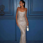 Lang, tætsiddende aftenkjole med tynde, glitrende stropper