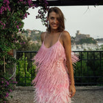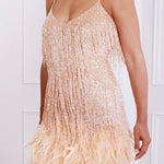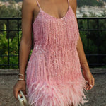 Aftenkjole med tynde stropper og pailletter, pyntet med fjer