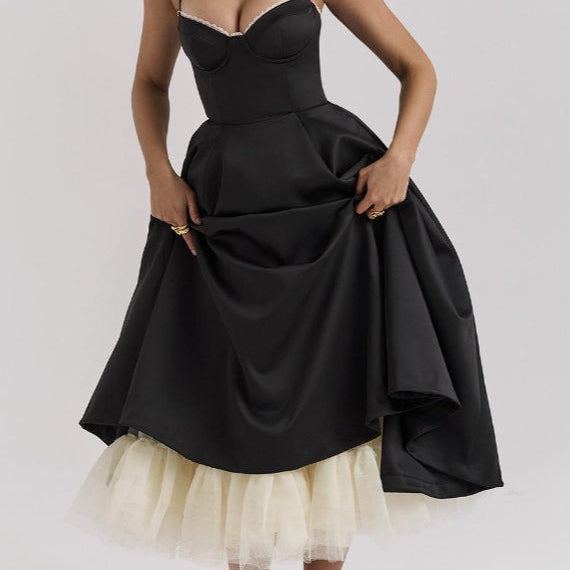 Stropløs, tætsiddende midi-aftenkjole