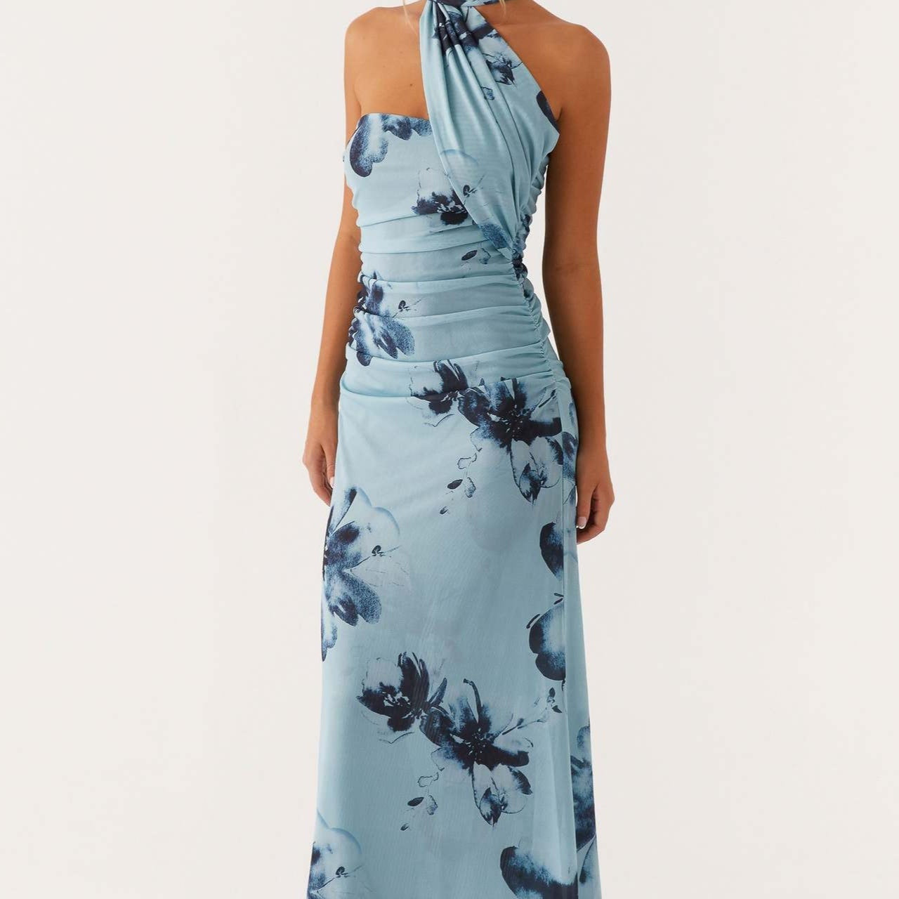 Blomsterprintet stropløs aftenkjole