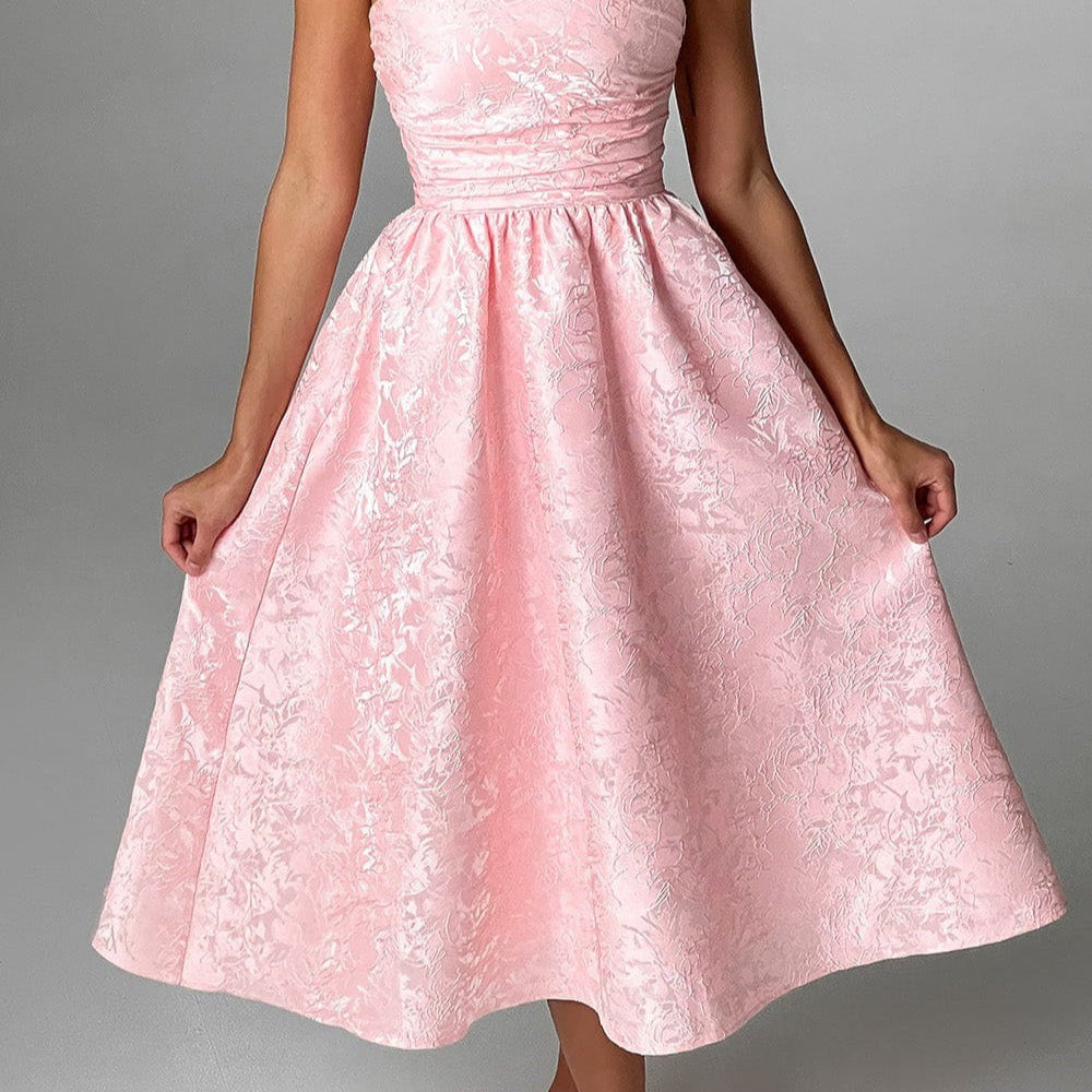 Stropløs trapez-aftenkjole i ensfarvet jacquard