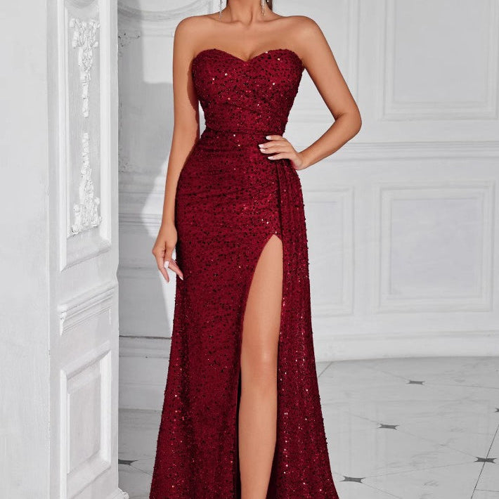 Stropløs maxi aftenkjole med slids