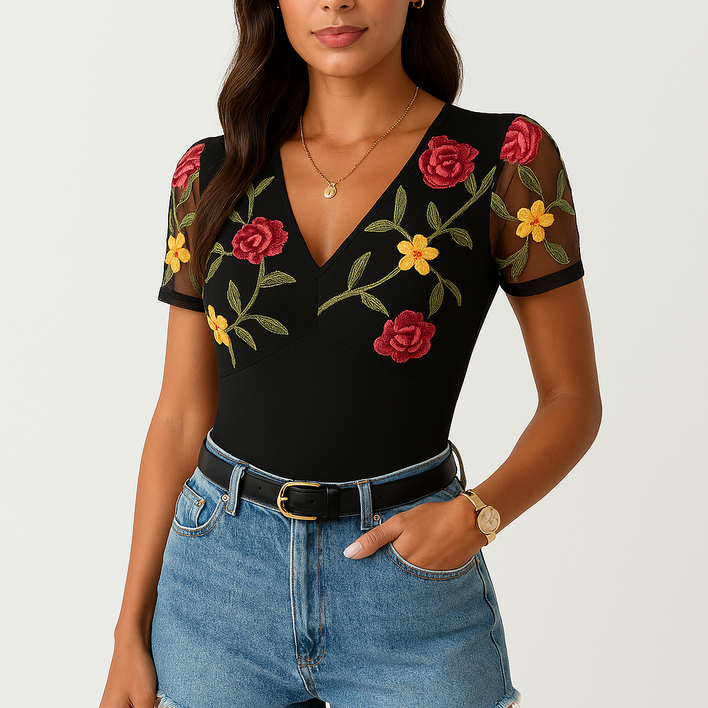 Body femme – Coupe ajustée – Manches courtes en tulle – Col en V brodé floral
