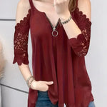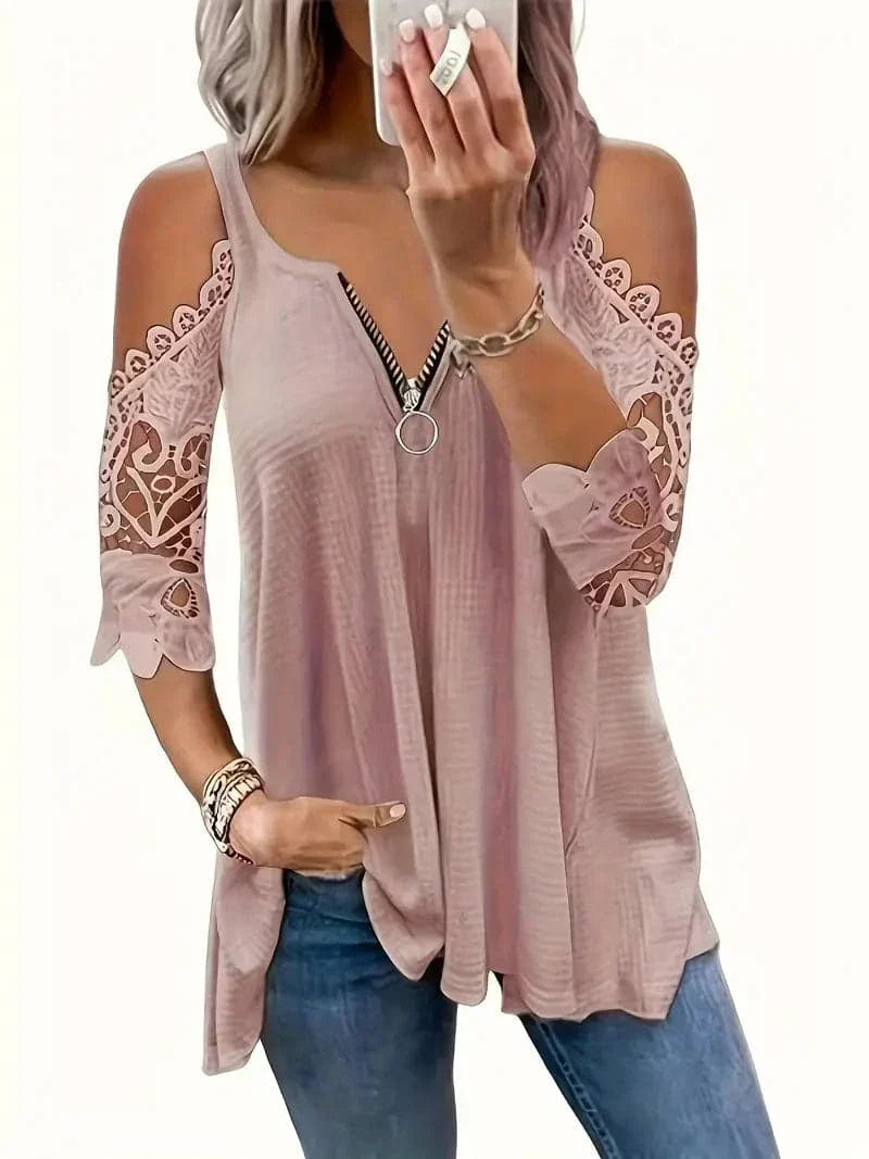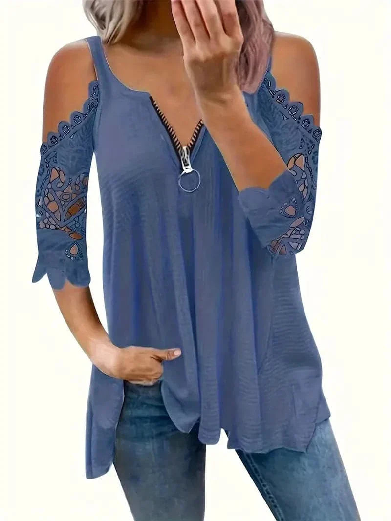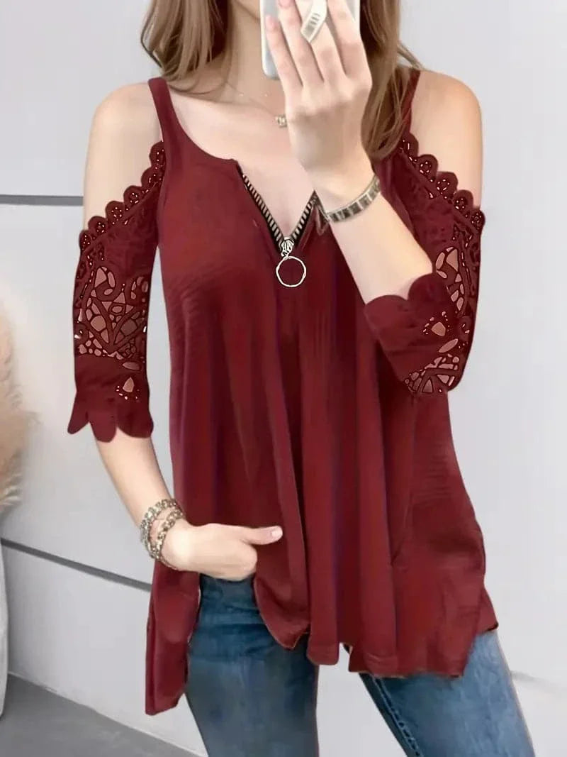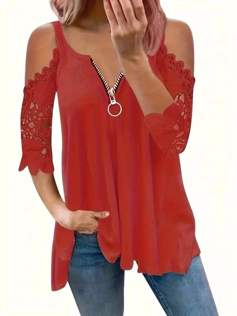 Opdag vores elegante off-shoulder blondebluse, en fusion af elegance og afslappet stil, perfekt til enhver lejlighed. Denne sofistikerede bluse har fine blondedetaljer på de off-shoulder ærmer, der tilføjer et strejf af femininitet og ynde. Den livlige røde nuance er designet til at få dig til at skille dig ud, mens V-halsen med en trendy lynlåsdetalje tilføjer et moderne touch.