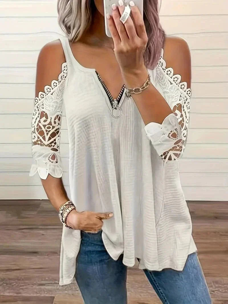 Uanset om du skal ud til brunch med vennerne, en afslappet dag på arbejdet eller en bytur, vil denne bluse blive dit foretrukne valg. Løft din garderobe med denne udsøgte off-shoulder bluse med blonder, og udstråle selvtillid, uanset hvor du går.