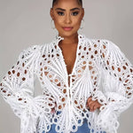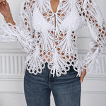 Slip din boheme-charme løs med vores fantastiske hæklede blondebluse, en perfekt blanding af elegance og moderne stil. Dette udsøgte stykke har et indviklet blondemønster, kunstfærdigt designet til at tilføje et strejf af sofistikering til dit hverdagslook.