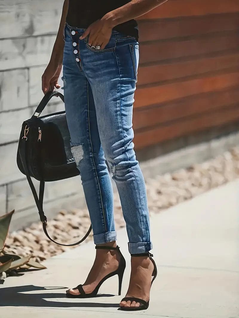 - Design: Lige ben med slidt effekt og slidte snit Sæson: Alle årstider Køn: Dame Anledning: Afslappede udflugter, weekender