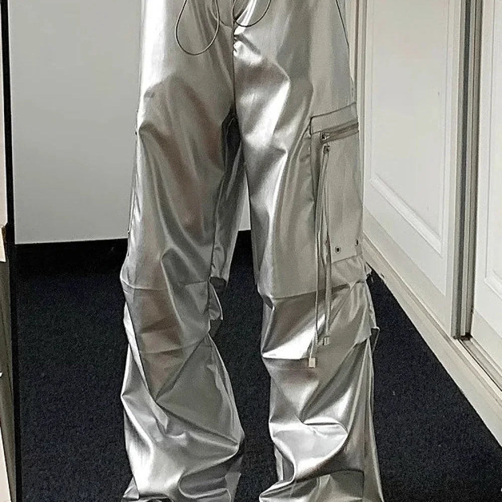 Højtaljede cargobukser med sølvfarvede opsmøg