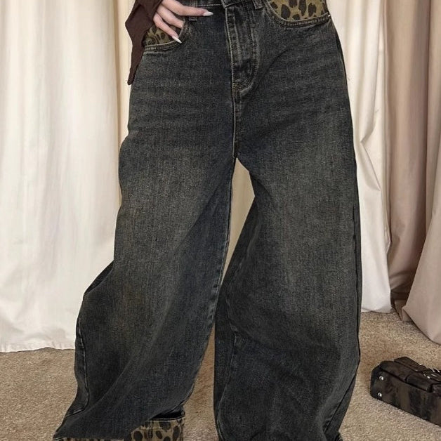 Vintage leopardprintede patchwork-jeans med vide ben og opsmøg