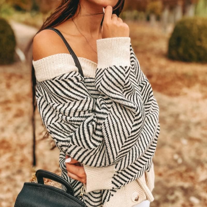 Med et alsidigt cremefarvet og sort sildebensmønster kan cardiganen dresses op eller ned, så den passer til enhver lejlighed. V-halsen indrammer ansigtet, mens de kraftige knapper tilføjer et strejf af originalitet. Stoffet er fremstillet af kvalitetsgarn, er blødt at røre ved og holder dig varm hele dagen lang.
