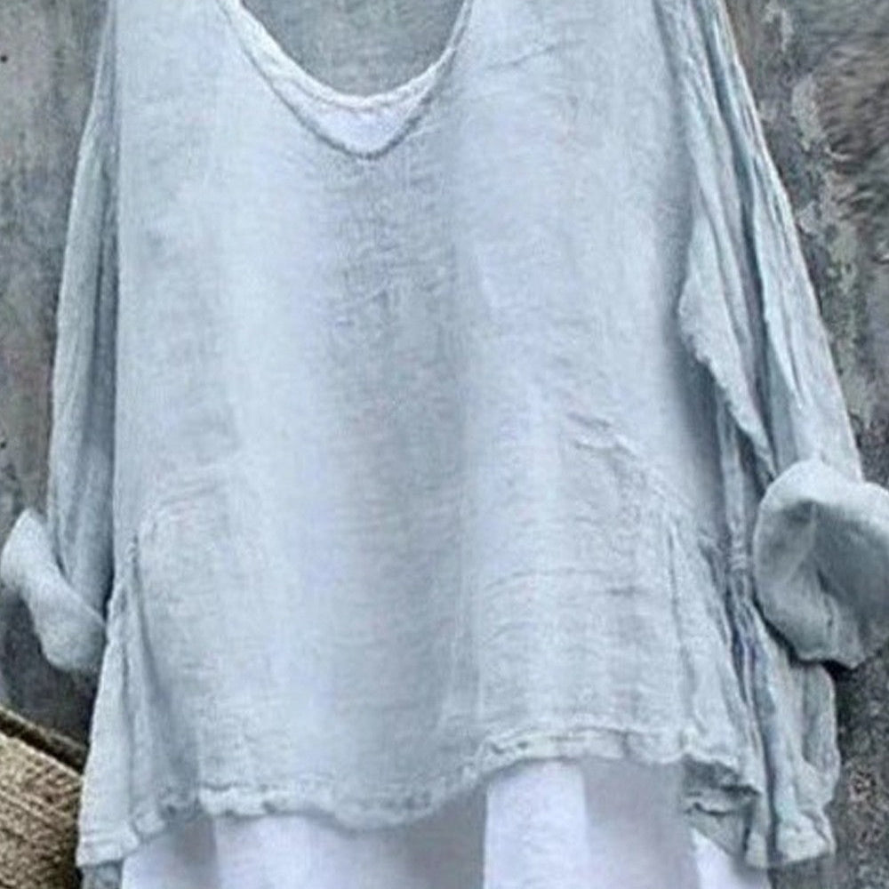 Dametop – Løs pasform – Hør og bomuld – Trekvartlange ærmer – Rund hals med rynket halsudskæring