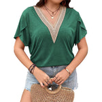 - Design: V-hals, blondedetaljer, afslappet pasform, korte ærmer