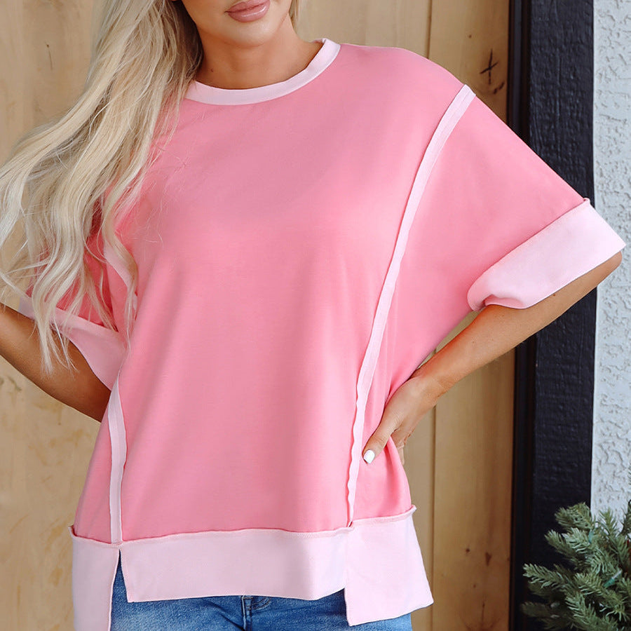 Kortærmet dametop – Løs pasform – Bomuldsstof – Farveblokdesign – Sideslids