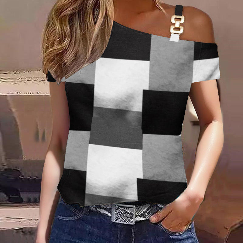 Kortærmet dametop – Afslappet pasform – Off-shoulder – Geometrisk mønster – Bomuld
