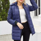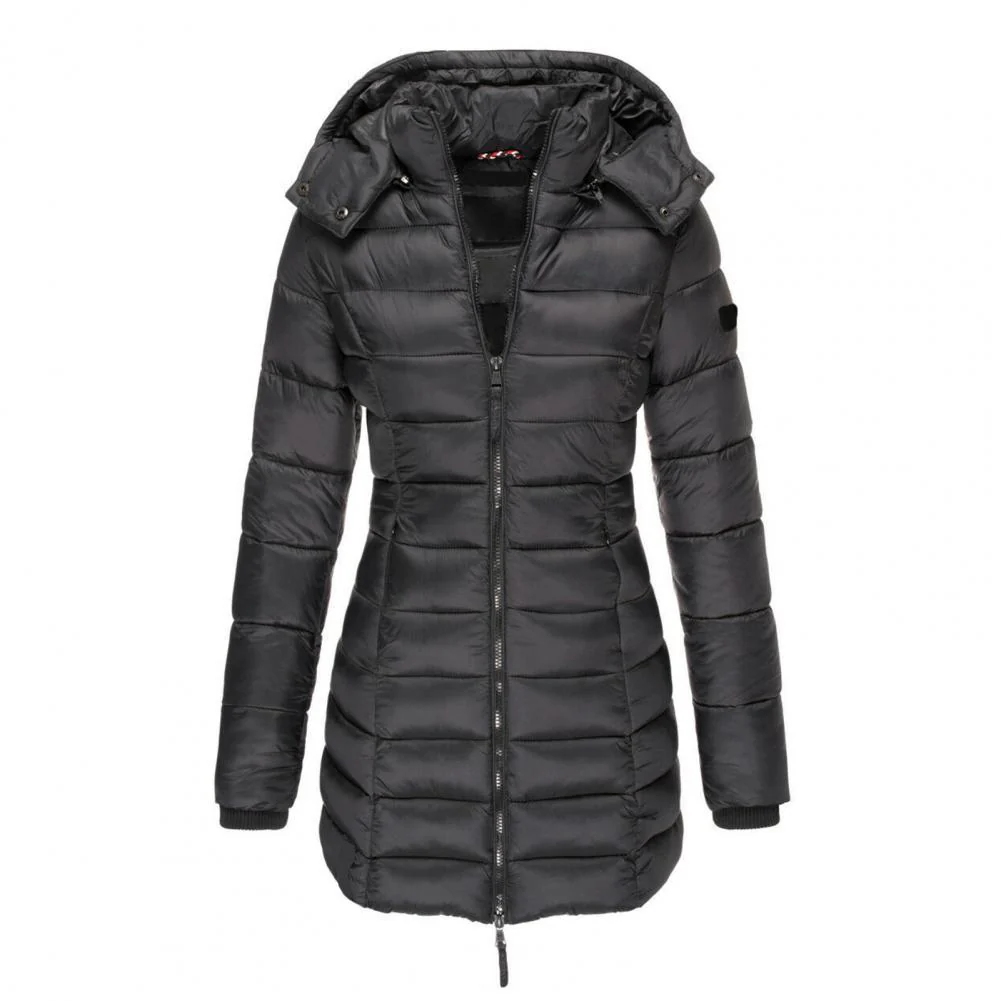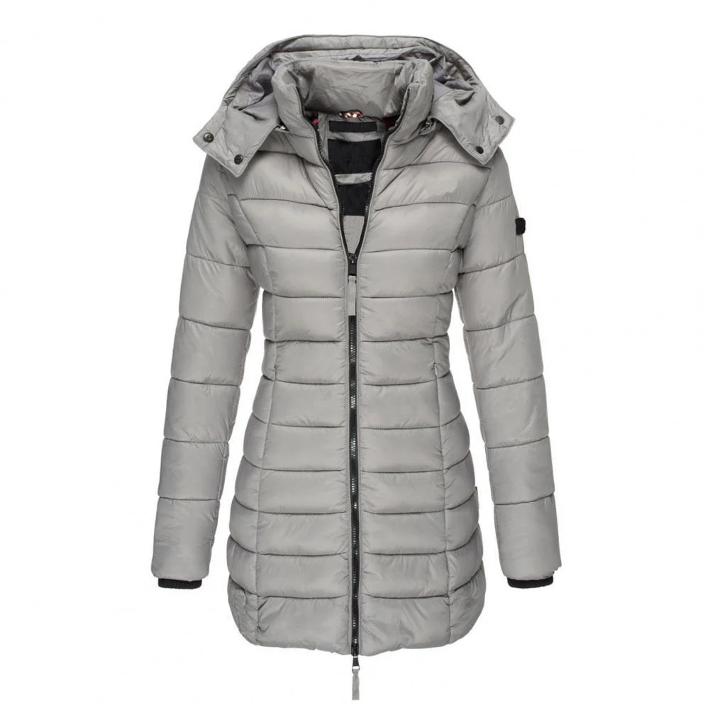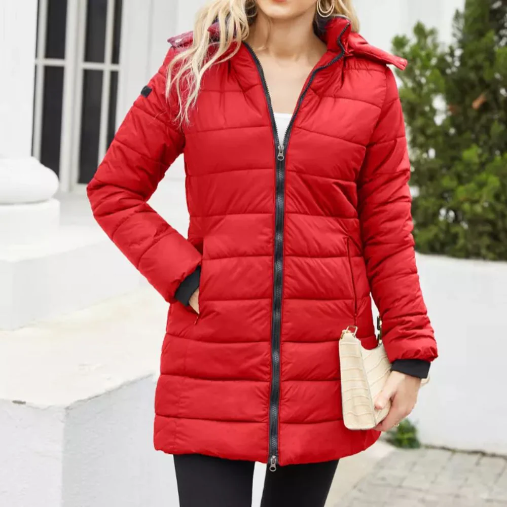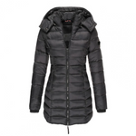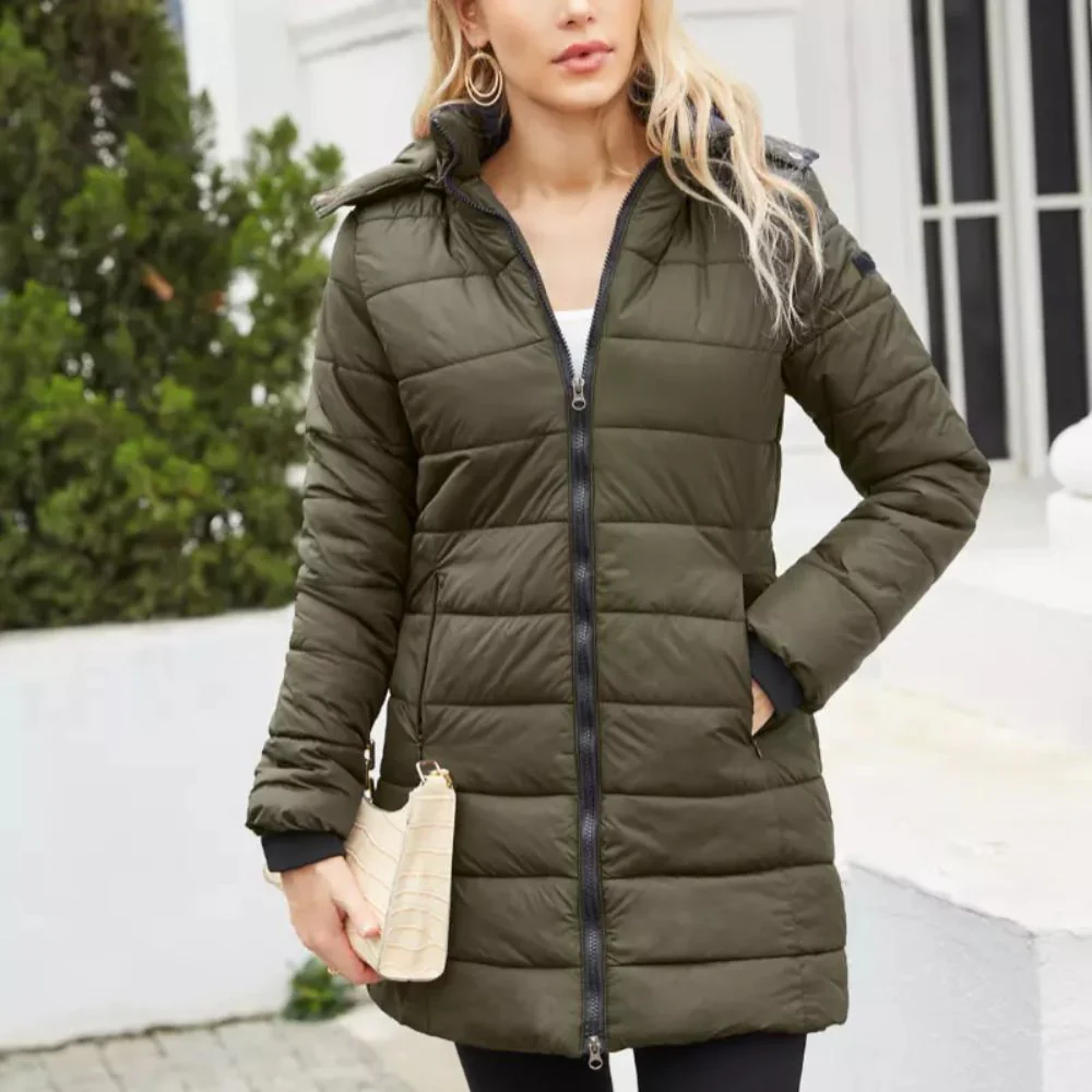 En quiltet damefrakke med et tætsiddende snit og længde til midt på låret. Den har en opretstående krave for ekstra beskyttelse.