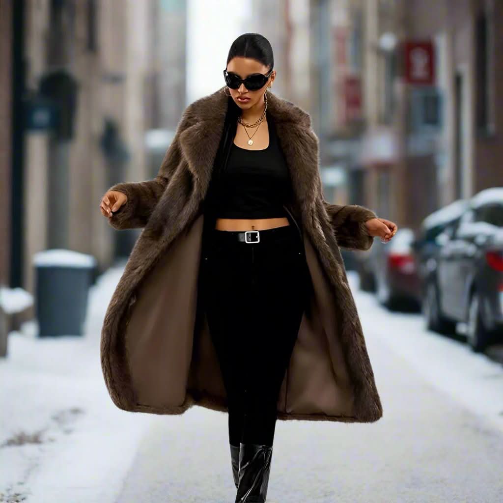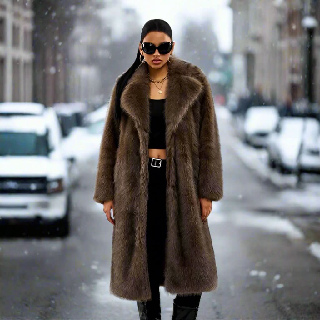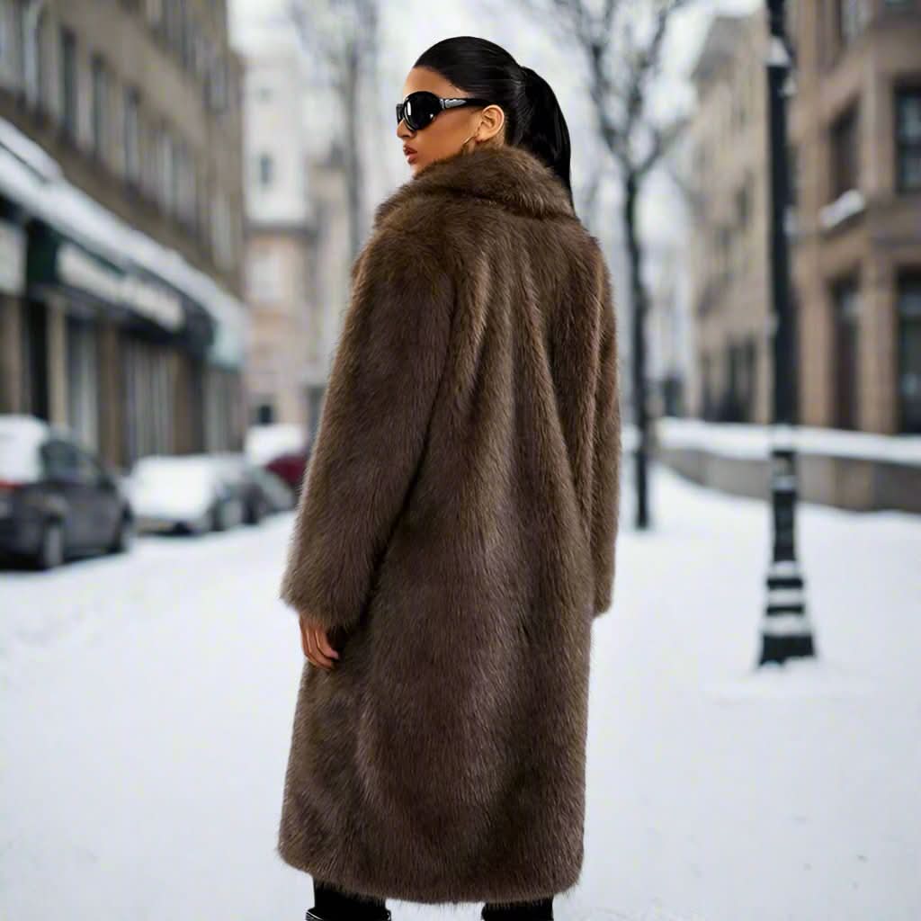 Pak dig ind i overdådighed med vores luksuriøse kunstpelsfrakke. Designet til den moderne kvinde, der værdsætter både stil og varme, tilbyder dette fantastiske stykke en blød, plysagtig tekstur, der udstråler sofistikering, samtidig med at det giver et hyggeligt lag mod vinterkulden.