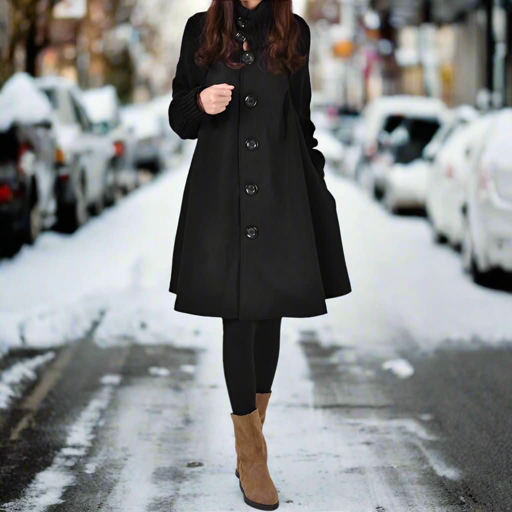 Den slanke A-formede silhuet klæder alle kropstyper og tilbyder et tidløst look. Den er lavet af en premium uldblanding, føles blød mod din hud og giver fremragende isolering. Funktionelle knapper tilføjer et elegant touch, samtidig med at den sikrer holdbarhed og brugervenlighed.