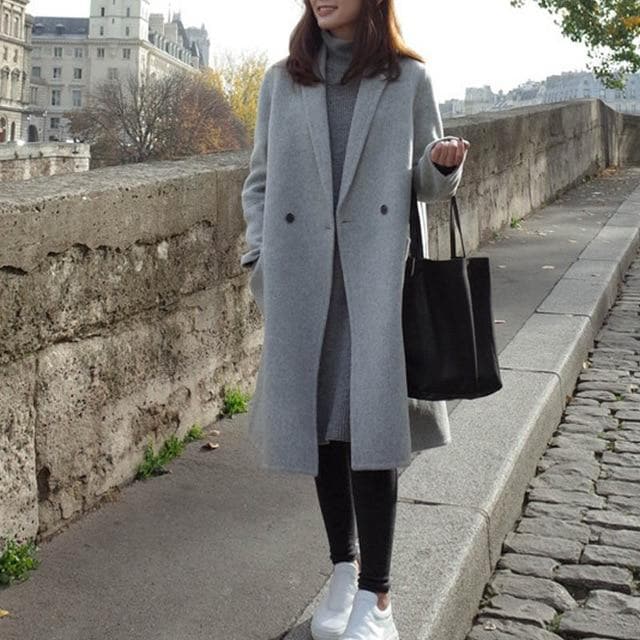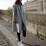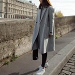 Frakkens elegante grå nuance er lige så alsidig, som den er stilfuld, hvilket gør den til den perfekte ledsager til ethvert outfit, uanset om du klæder dig på til et forretningsmøde eller holder det afslappet til en weekendtur. Dens dobbeltradede lukning og spidse revers giver en selvsikker følelse af stil, mens det mellemlange snit giver rigelig beskyttelse mod elementerne.