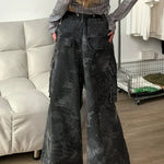 Cargobukser i denim med flere lommer og slangemønstret camouflage