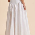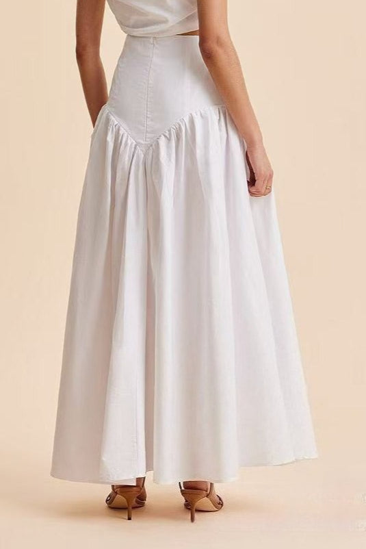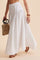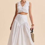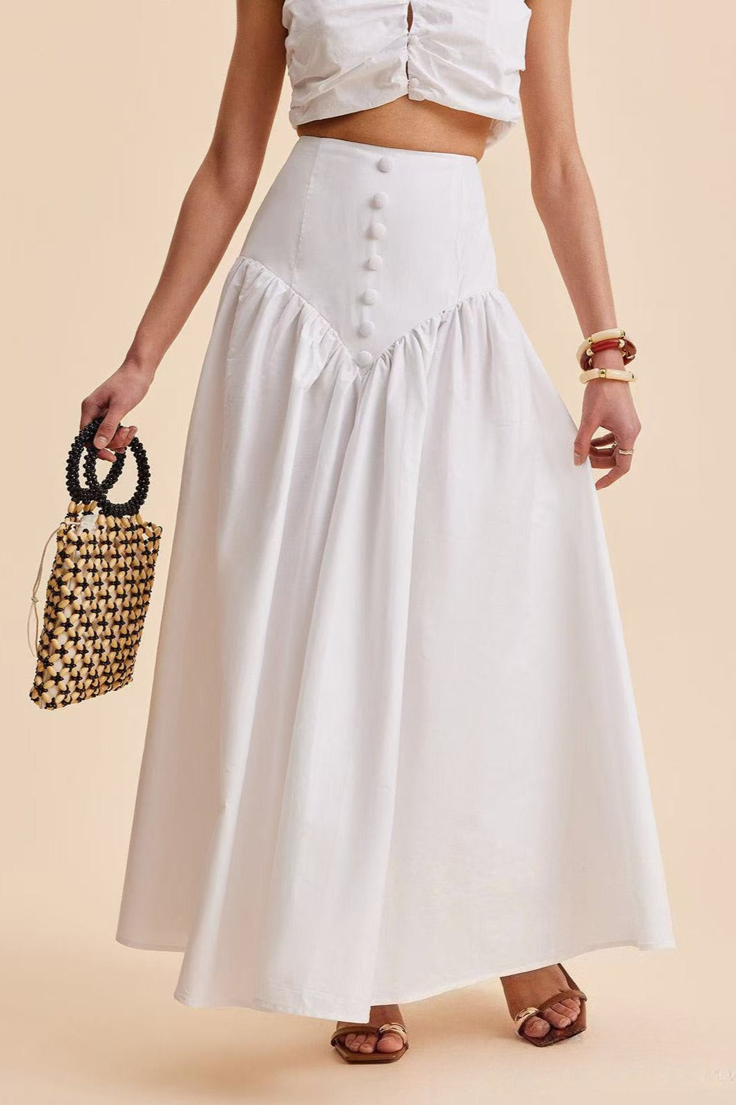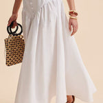 Elegant hvid maxinederdel med høj talje og patchwork-knapper