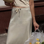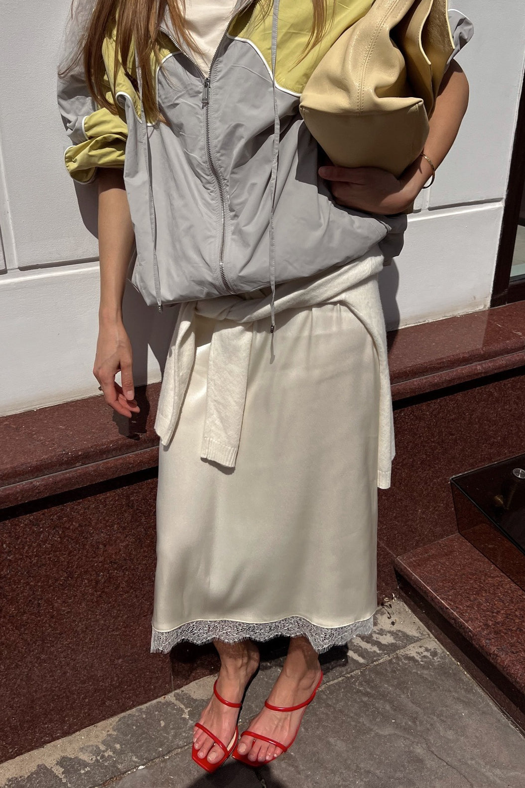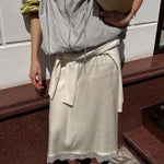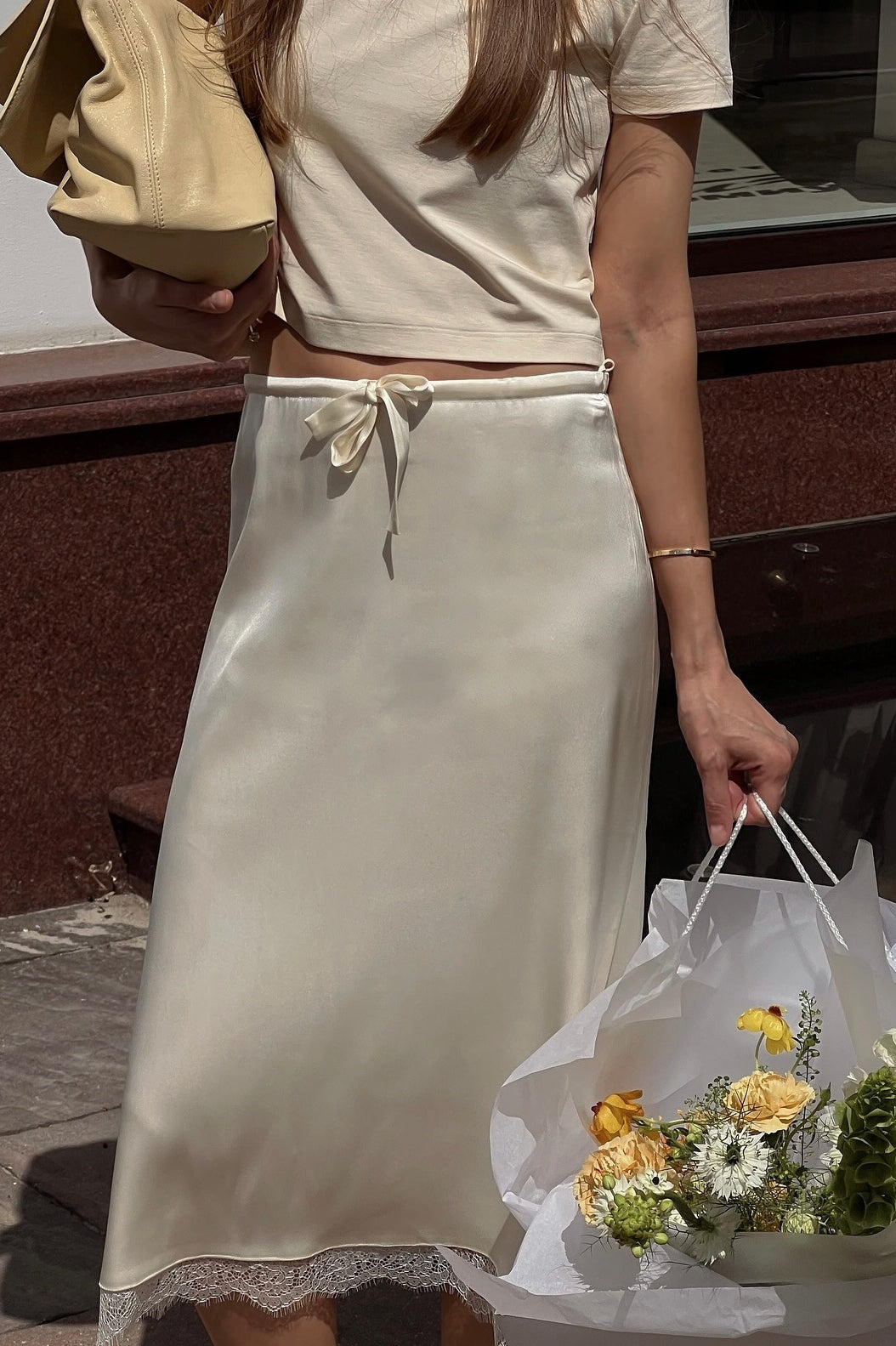 Elegant midi-nederdel med blondekant og bindebånd i taljen