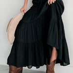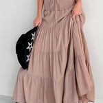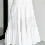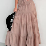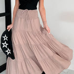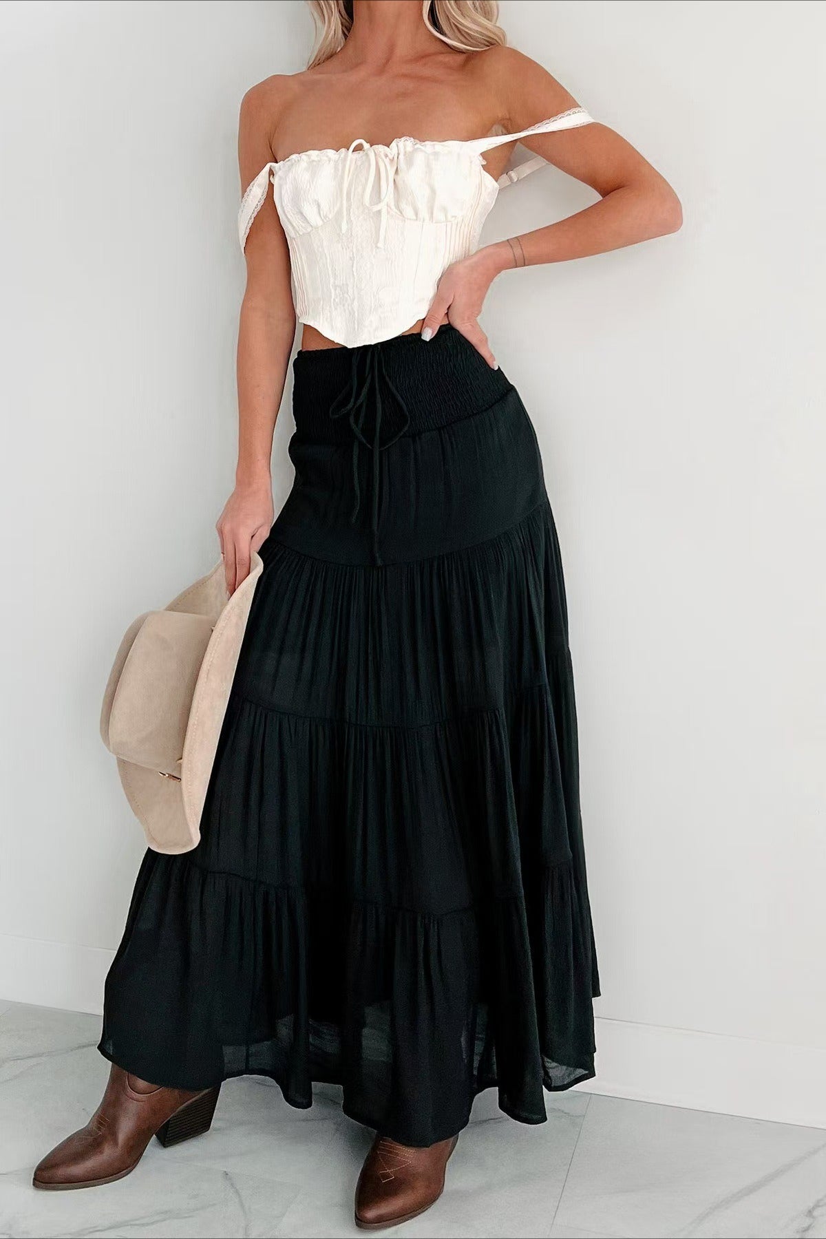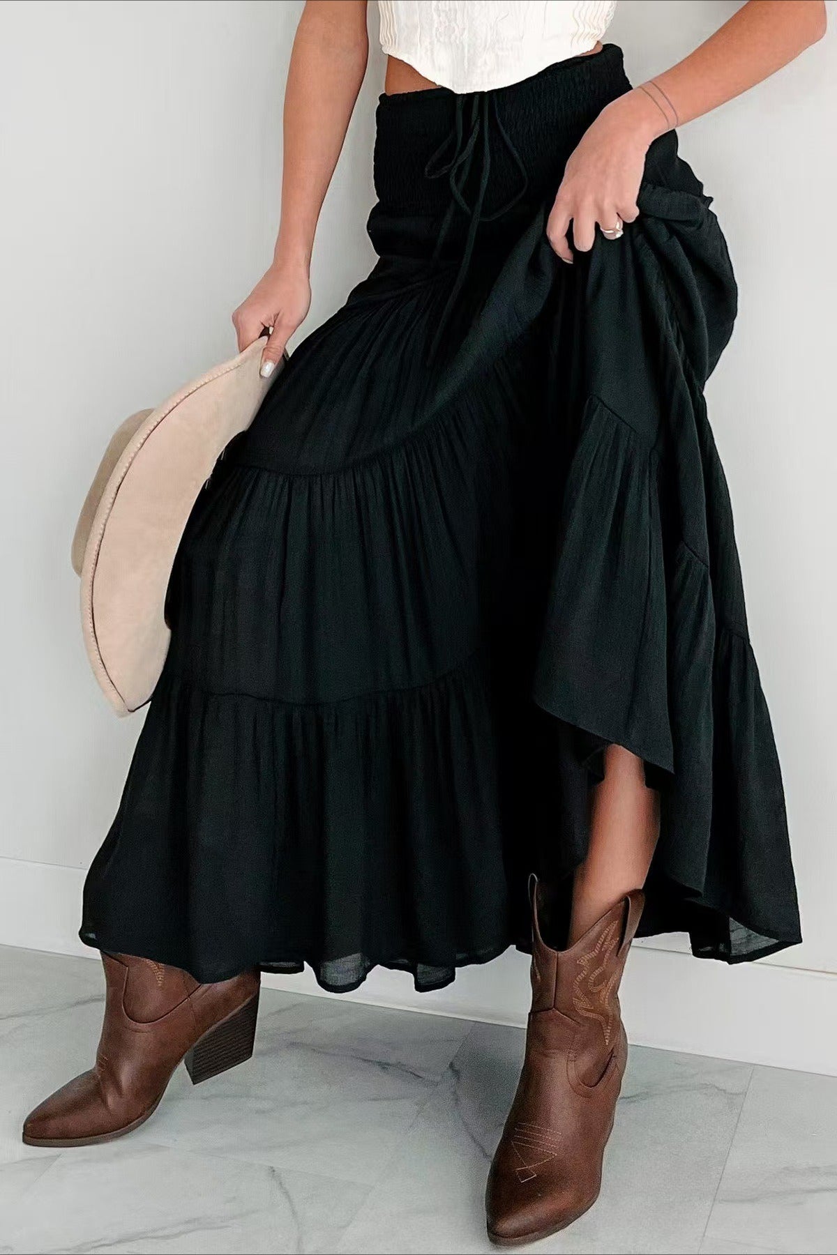 Lang, højtaljet A-formet nederdel med kontrasterende snøre, boheme-chic stil