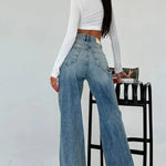 Højtaljede, smalle jeans med vide ben og farveblok