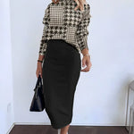 Damesæt i to dele – Stretchstrik – Langærmet top – Tætsiddende midi-nederdel