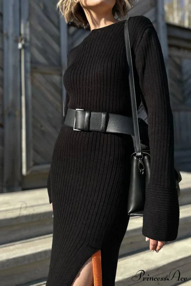 Ribbet strikkjole med slids i siden og kontrastdetaljer