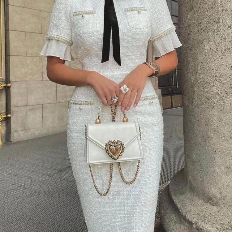 Elegant tweed midikjole pyntet med perler og sløjfe