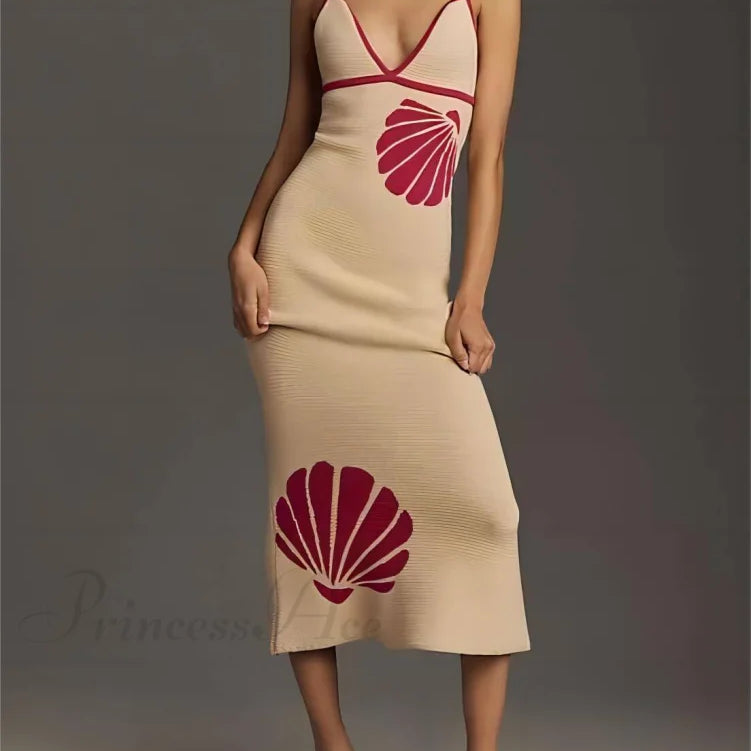 Rygløs midikjole med halterneck og dyb V-udskæring, charmerende blomstret kjole.