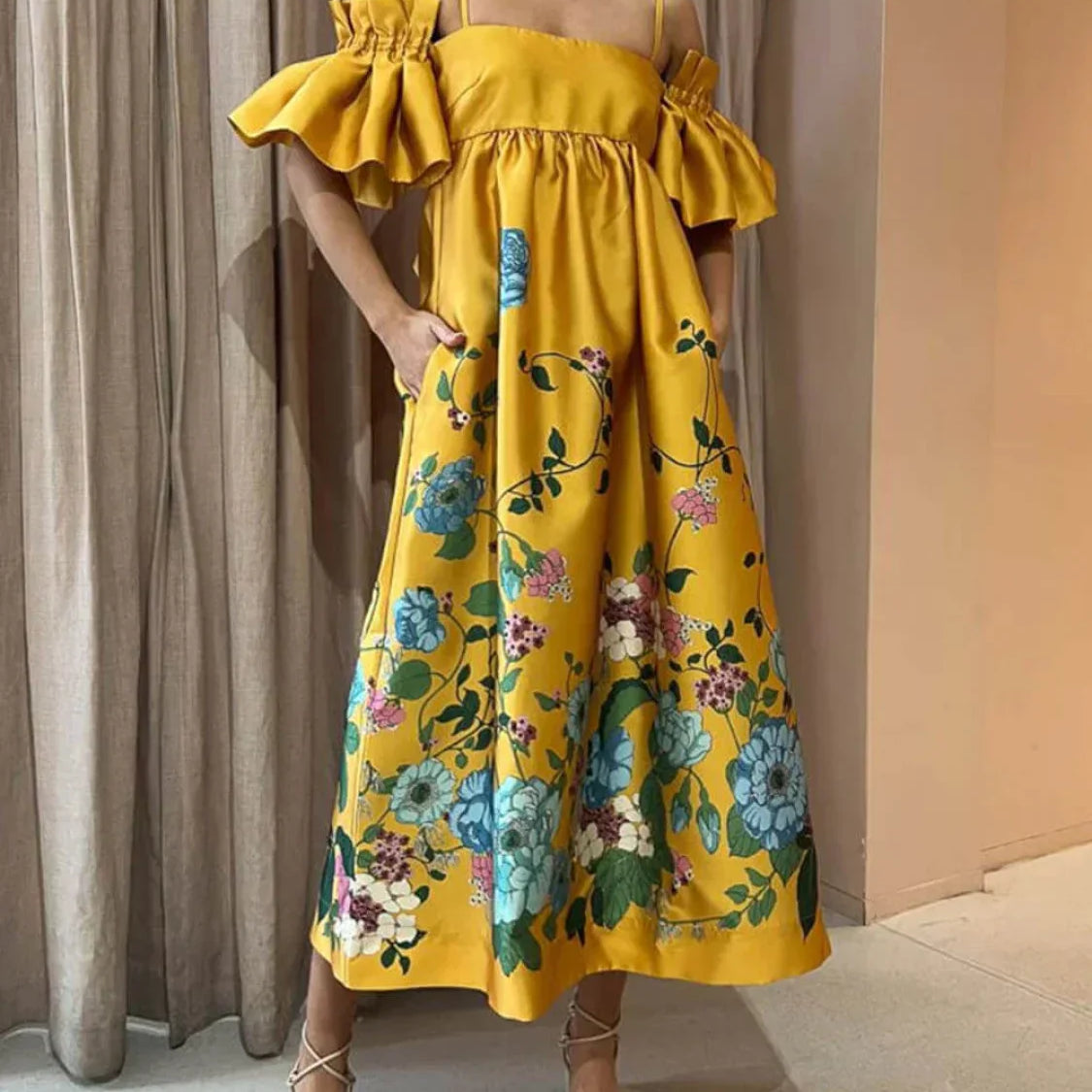 Unik midikjole med blomsterprint og pufærmer, folkestil, ideel til fester