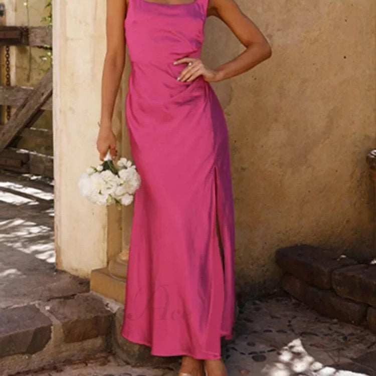 Sommerlige midikjoler i satin med åben ryg, charmerende brudepige- og gallakjoler