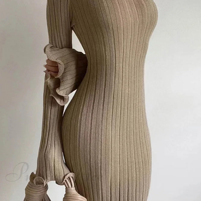Ribstrikket kjole med lange, vidde ærmer og åben ryg