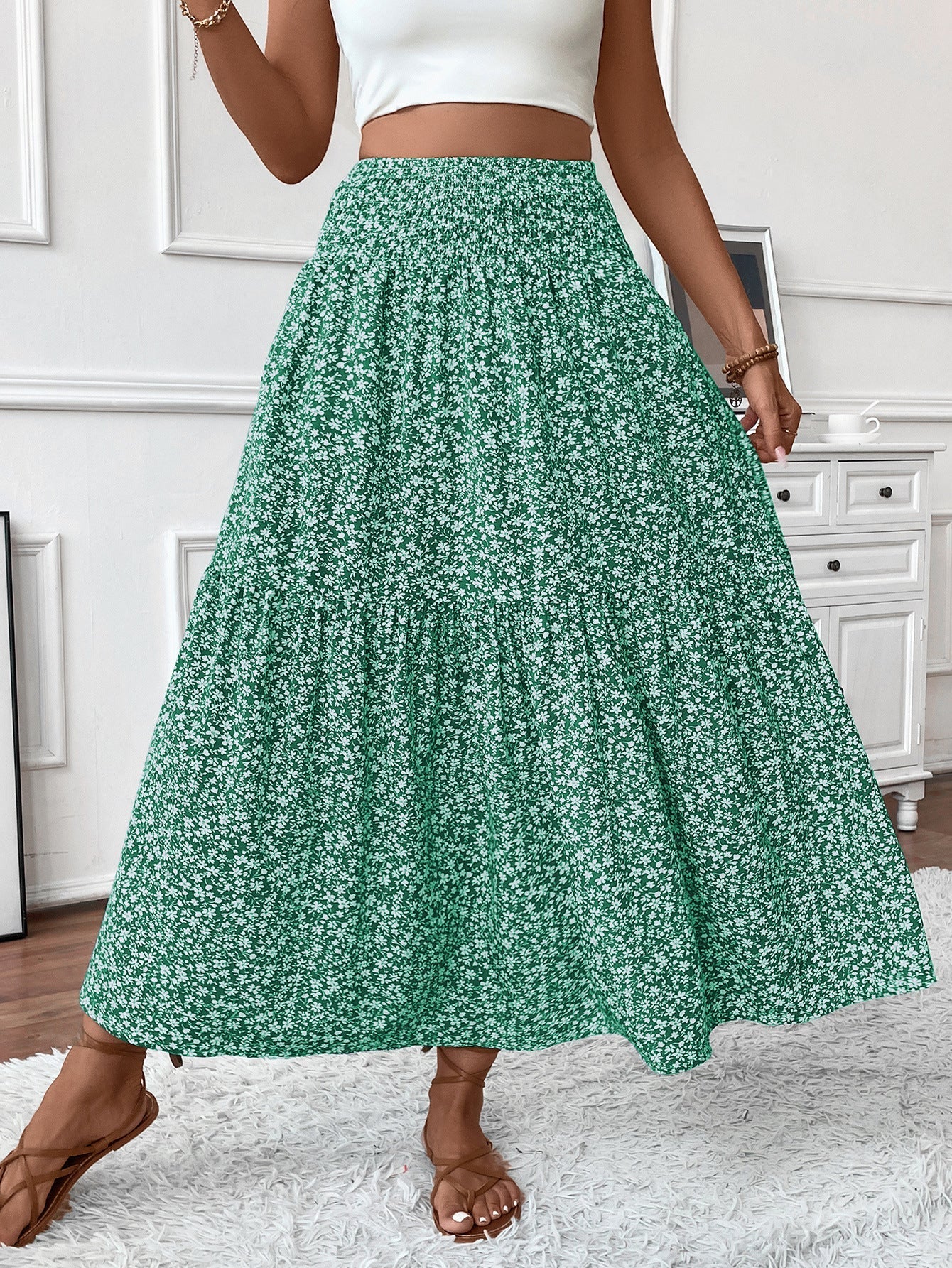Lang damenederdel - Elastik i taljen - Flæsemønster - Blomsterprint