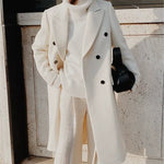 Lang damefrakke – Tætsiddende snit – Uldlignende stof – Dobbeltradet lukning – Klassisk krave