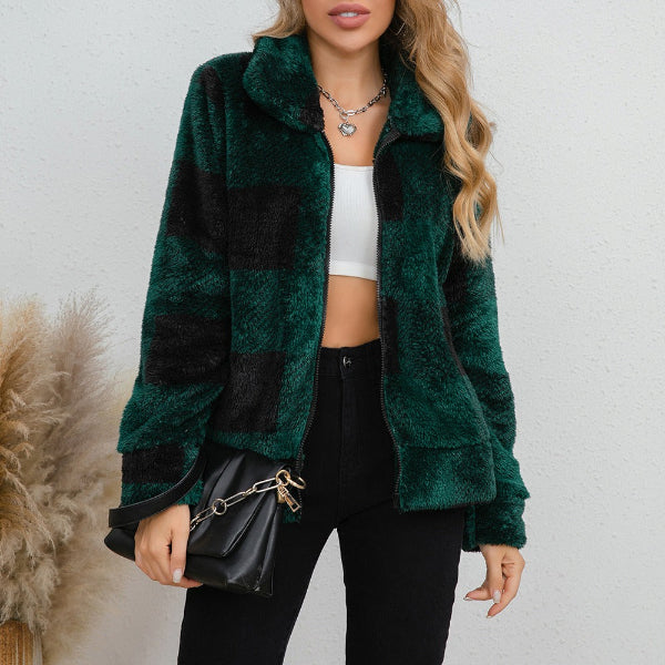 Damejakke – Oversized pasform – Imiteret lammeskind – Ternet mønster – Lynlåslukning