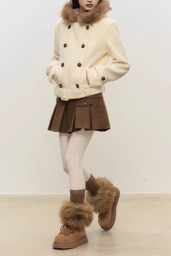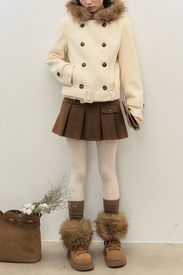 Tyk uldfrakke med hætte og tætsiddende talje, dobbeltradet