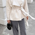 Tyk, varm, ensfarvet ruskindsfrakke med bundet bælte