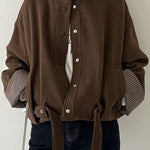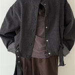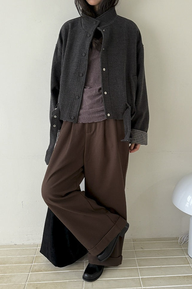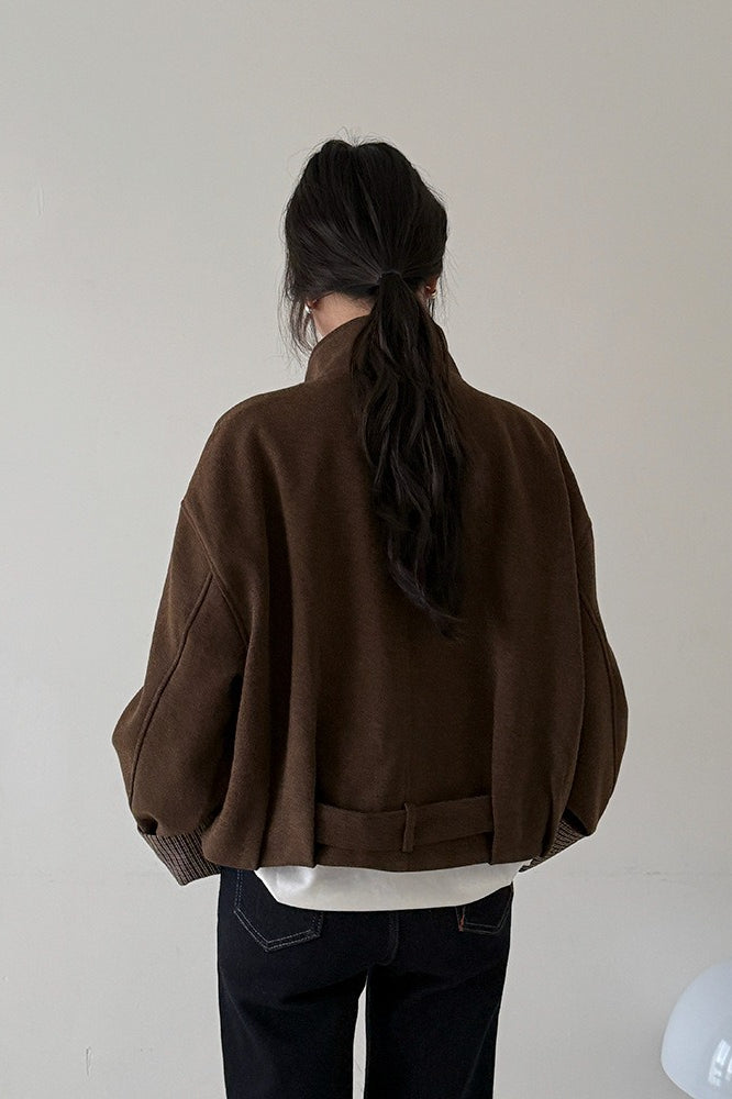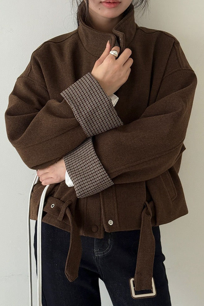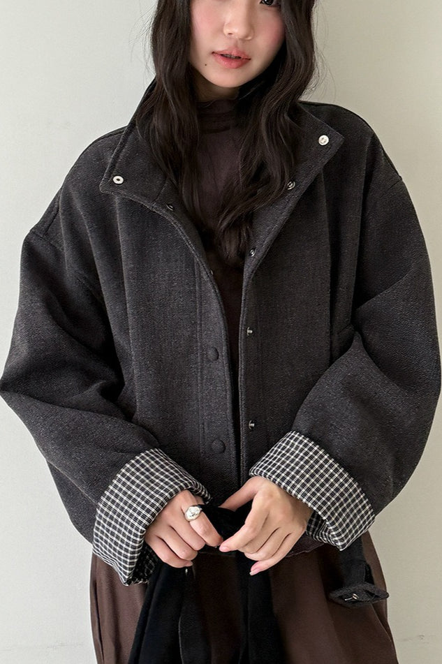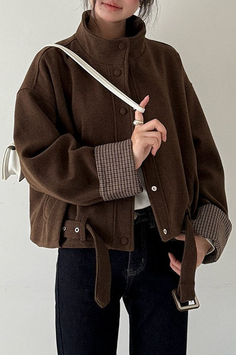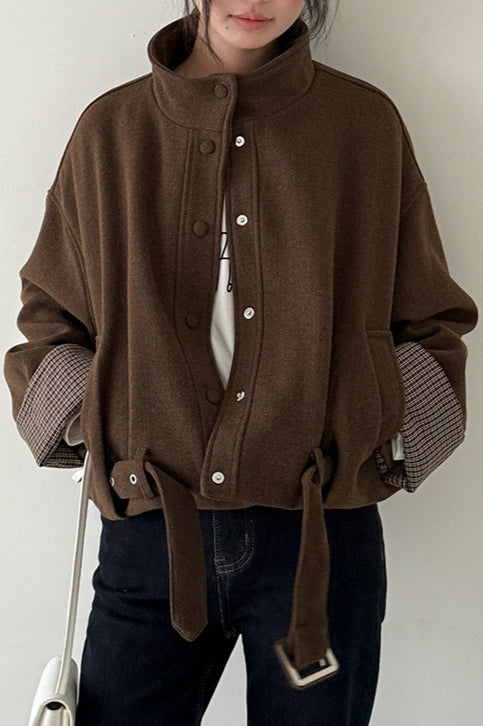 Uldfrakke med opretstående krave og ternede paneler, korte manchetter