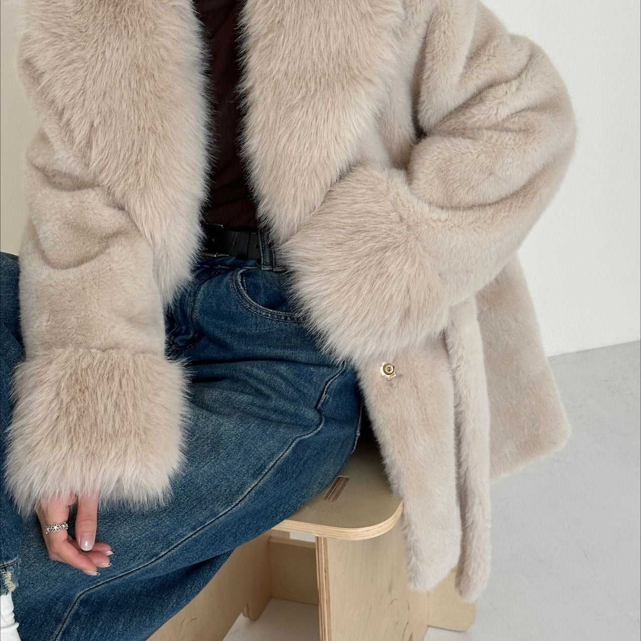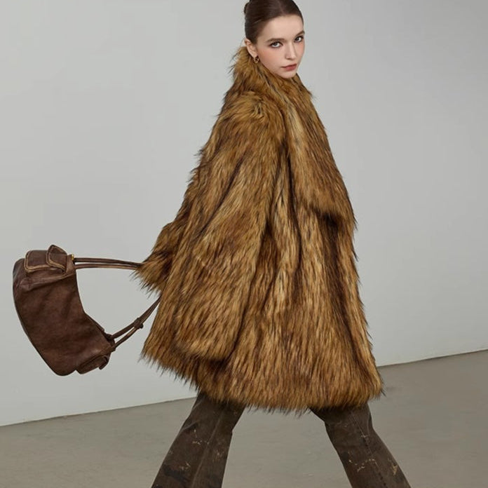 Mellemlang, løstsiddende, varm frakke i blød, varm kunstpels med hak i kraven